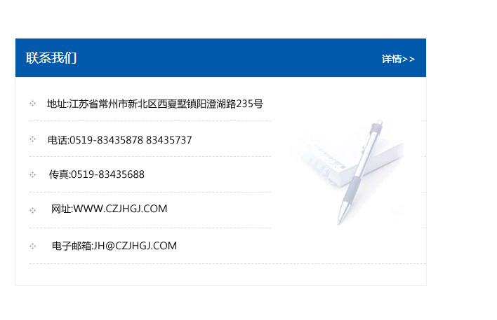 地址:常州市新北區友邦商務大廈1幢16、17層  電話:0519-85101652  傳真:0519-85112595  郵編:213022  網址:www.cz-jiayue_cn.jiaoguanzc.com  郵箱:xiajifengaa@163.com